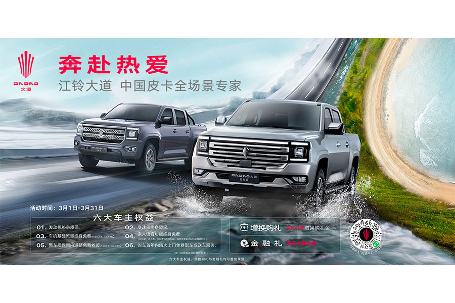 更長的質量擔保:江鈴(商用車)自2018年起零件最高質量擔保期為24個月或20萬公里(乘用車自2018年起執(zhí)行整車不低于36個月或10萬公里的質量擔保期),新車提供首次免費保養(yǎng)服務。