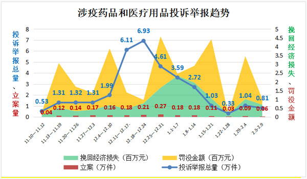 “二十條”和“新十條”出臺(tái)后,疫情防疫重心從防控感染轉(zhuǎn)到醫(yī)療救治,涉疫藥品和醫(yī)療用品需求激增、供應(yīng)不暢,價(jià)格異常波動(dòng)、產(chǎn)品質(zhì)量問(wèn)題頻現(xiàn),相關(guān)投訴舉報(bào)咨詢量一度呈井噴式增長(zhǎng)。2022年11月10日至2022年底,全國(guó)12315平臺(tái)接收相關(guān)投訴舉報(bào)24.11萬(wàn)件,同比增長(zhǎng)3.88倍,環(huán)比增長(zhǎng)2.95倍,最高峰值達(dá)到19.5倍。其中,投訴14.18萬(wàn)件,舉報(bào)9.93萬(wàn)件,挽回經(jīng)濟(jì)損失498.17萬(wàn)元。