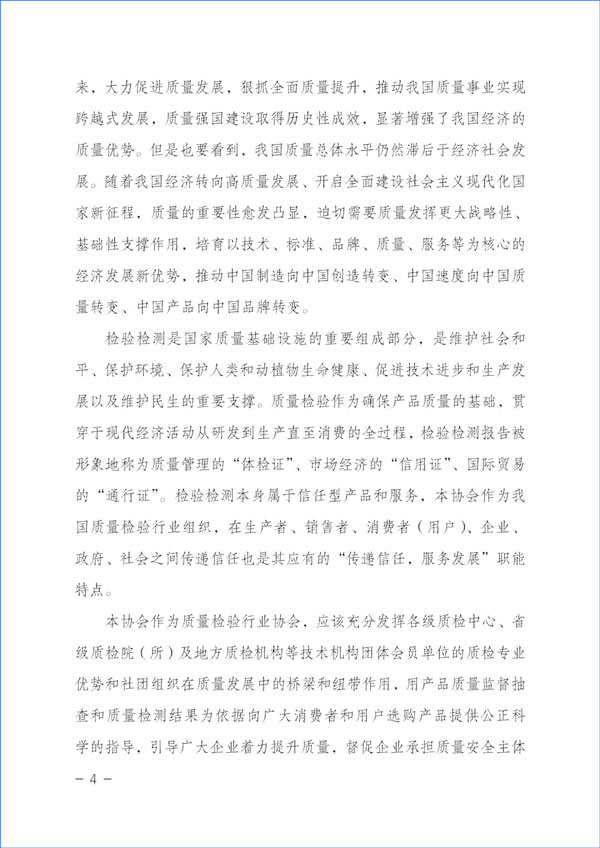 本協(xié)會(huì)作為質(zhì)量檢驗(yàn)行業(yè)協(xié)會(huì),應(yīng)該充分發(fā)揮各級(jí)質(zhì)檢中心、省級(jí)質(zhì)檢院(所)及地方質(zhì)檢機(jī)構(gòu)等技術(shù)機(jī)構(gòu)團(tuán)體會(huì)員單位的質(zhì)檢專(zhuān)業(yè)優(yōu)勢(shì)和社團(tuán)組織在質(zhì)量發(fā)展中的橋梁和紐帶作用,用產(chǎn)品質(zhì)量監(jiān)督抽查和質(zhì)量檢測(cè)結(jié)果為依據(jù)向廣大消費(fèi)者和用戶(hù)選購(gòu)產(chǎn)品提供公正科學(xué)的指導(dǎo),引導(dǎo)廣大企業(yè)著力提升質(zhì)量,督促企業(yè)承擔(dān)質(zhì)量安全主體作用,倡導(dǎo)企業(yè)自覺(jué)履行社會(huì)責(zé)任,并切實(shí)運(yùn)用輿論宣傳作用,向全社會(huì)提供公正可靠的質(zhì)量信息和消費(fèi)信息,傳遞質(zhì)量信任,引導(dǎo)質(zhì)量消費(fèi),有效幫助消費(fèi)者選擇高標(biāo)準(zhǔn)高質(zhì)量產(chǎn)品,助力質(zhì)量供給側(cè)結(jié)構(gòu)性改革,抓好質(zhì)量提升,推進(jìn)質(zhì)量強(qiáng)國(guó)建設(shè)。