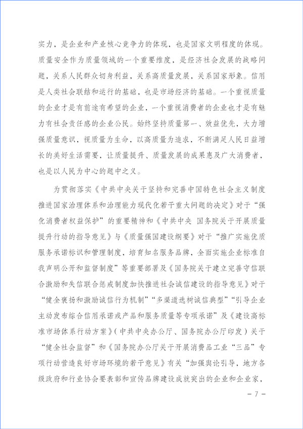質(zhì)量興則經(jīng)濟(jì)興,質(zhì)量強(qiáng)則國(guó)家強(qiáng)。質(zhì)量反映一個(gè)國(guó)家的綜合實(shí)力,是企業(yè)和產(chǎn)業(yè)核心競(jìng)爭(zhēng)力的體現(xiàn),也是國(guó)家文明程度的體現(xiàn)。質(zhì)量安全作為質(zhì)量領(lǐng)域的一個(gè)重要維度,是經(jīng)濟(jì)社會(huì)發(fā)展的戰(zhàn)略問(wèn)題,關(guān)系人民群眾切身利益,關(guān)系高質(zhì)量發(fā)展,關(guān)系國(guó)家形象。信用是人類(lèi)社會(huì)聯(lián)結(jié)和運(yùn)行的基礎(chǔ),也是市場(chǎng)經(jīng)濟(jì)的基礎(chǔ)。一個(gè)重視質(zhì)量的企業(yè)才是有前途有希望的企業(yè),一個(gè)重視消費(fèi)者的企業(yè)也才是有魅力有社會(huì)責(zé)任感的企業(yè)公民。始終堅(jiān)持質(zhì)量第一、效益優(yōu)先,大力增強(qiáng)質(zhì)量意識(shí),視質(zhì)量為生命,以高質(zhì)量為追求,不斷滿(mǎn)足人民日益增長(zhǎng)的美好生活需要,讓質(zhì)量提升、質(zhì)量發(fā)展的成果惠及廣大消費(fèi)者,也是以人民為中心的題中之義。