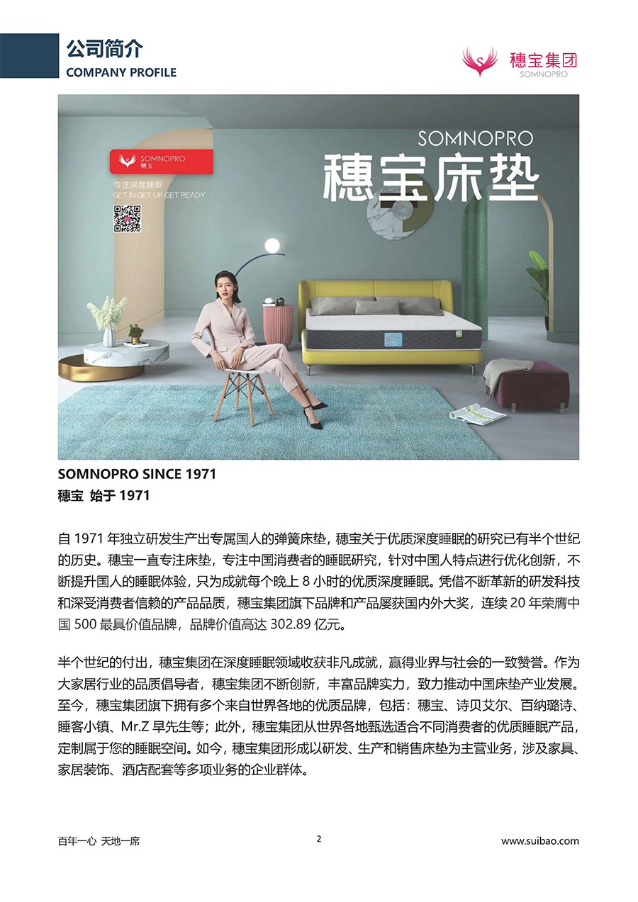 作為大家居行業(yè)的品質(zhì)倡導(dǎo)者,穗寶集團(tuán)不斷創(chuàng)新,豐富品牌實(shí)力,致力推動(dòng)中國(guó)床墊產(chǎn)業(yè)發(fā)展。至今,穗寶集團(tuán)旗下?lián)碛卸鄠€(gè)來(lái)自世界各地的優(yōu)質(zhì)品牌,包括:穗寶、詩(shī)貝艾爾、百納璐詩(shī)、睡客小鎮(zhèn)、Mr.Z早先生等;此外,穗寶集團(tuán)從世界各地甄選適合不同消費(fèi)者的優(yōu)質(zhì)睡眠產(chǎn)品,定制屬于您的睡眠空間。如今,穗寶集團(tuán)形成以研發(fā)、生產(chǎn)和銷售床墊為主營(yíng)業(yè)務(wù),涉及家具、家居裝飾、酒店配套等多項(xiàng)業(yè)務(wù)的企業(yè)群體。