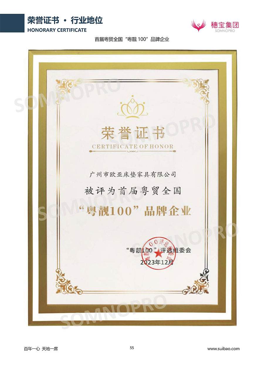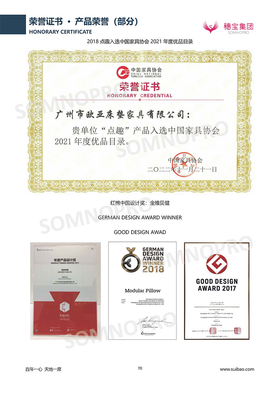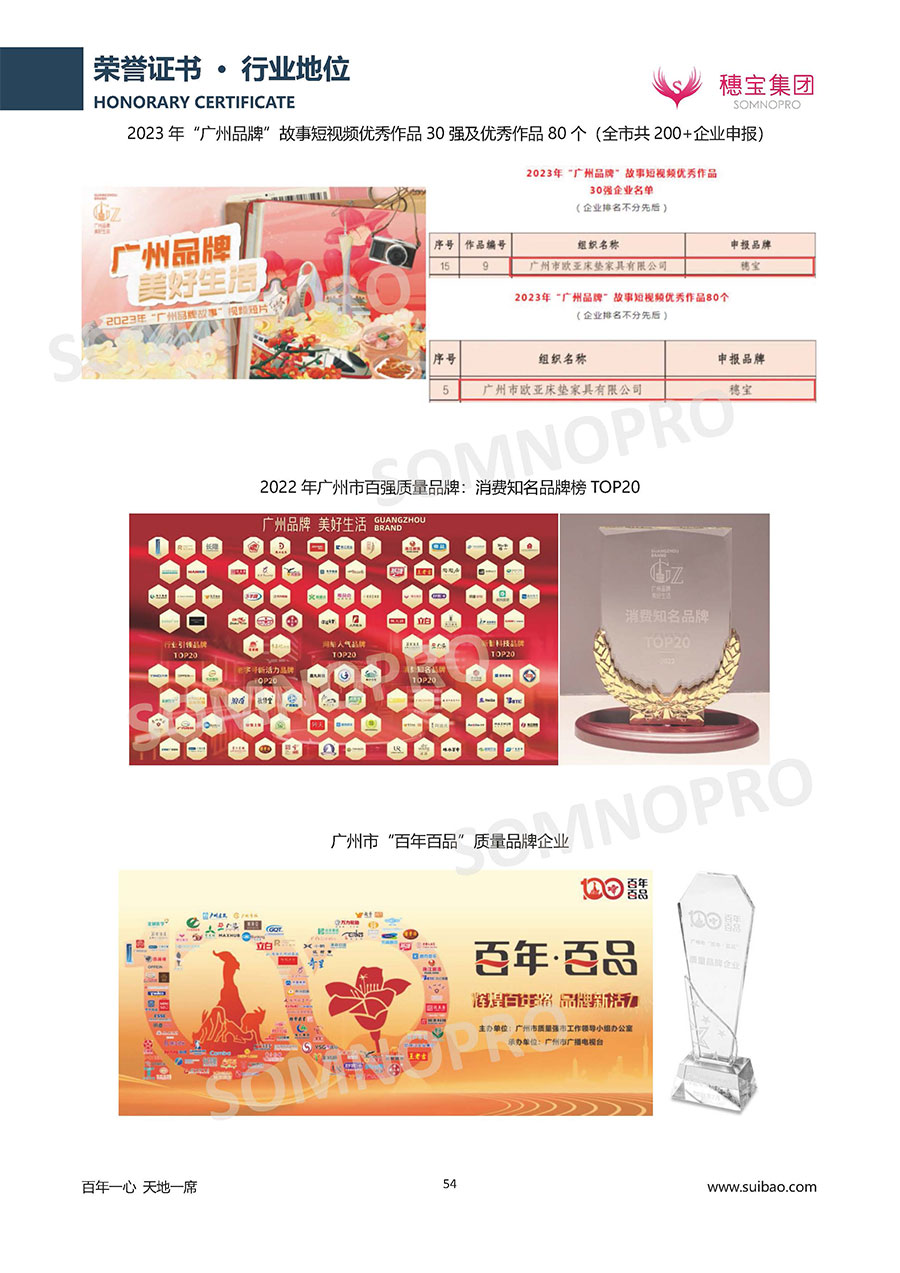 自1971年獨(dú)立研發(fā)生產(chǎn)出專屬國(guó)人的彈簧床墊,穗寶關(guān)于優(yōu)質(zhì)深度睡眠的研究已有半個(gè)世紀(jì)的歷史。穗寶一直專注床墊,專注中國(guó)消費(fèi)者的睡眠研究,針對(duì)中國(guó)人特點(diǎn)進(jìn)行優(yōu)化創(chuàng)新,不斷提升國(guó)人的睡眠體驗(yàn),只為成就每個(gè)晚上8小時(shí)的優(yōu)質(zhì)深度睡眠。憑借不斷革新的研發(fā)科技和深受消費(fèi)者信賴的產(chǎn)品品質(zhì),穗寶集團(tuán)旗下品牌和產(chǎn)品屢獲國(guó)內(nèi)外大獎(jiǎng),連續(xù)20年榮膺中國(guó)500最具價(jià)值品牌,品牌價(jià)值高達(dá)302.89億元。