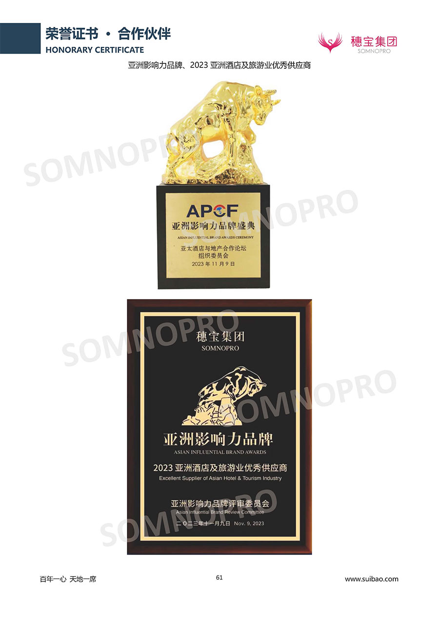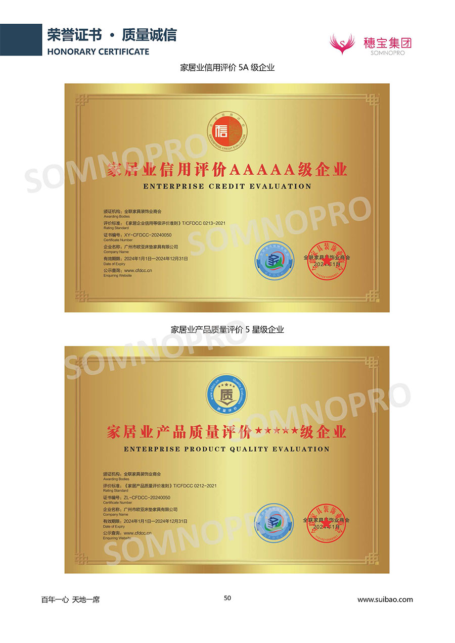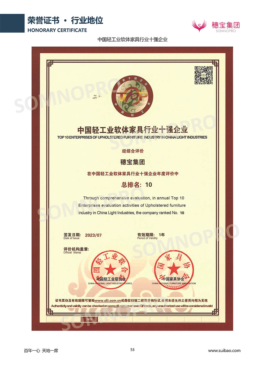 自1971年獨(dú)立研發(fā)生產(chǎn)出專屬國(guó)人的彈簧床墊,穗寶關(guān)于優(yōu)質(zhì)深度睡眠的研究已有半個(gè)世紀(jì)的歷史。穗寶一直專注床墊,專注中國(guó)消費(fèi)者的睡眠研究,針對(duì)中國(guó)人特點(diǎn)進(jìn)行優(yōu)化創(chuàng)新,不斷提升國(guó)人的睡眠體驗(yàn),只為成就每個(gè)晚上8小時(shí)的優(yōu)質(zhì)深度睡眠。憑借不斷革新的研發(fā)科技和深受消費(fèi)者信賴的產(chǎn)品品質(zhì),穗寶集團(tuán)旗下品牌和產(chǎn)品屢獲國(guó)內(nèi)外大獎(jiǎng),連續(xù)20年榮膺中國(guó)500最具價(jià)值品牌,品牌價(jià)值高達(dá)302.89億元。