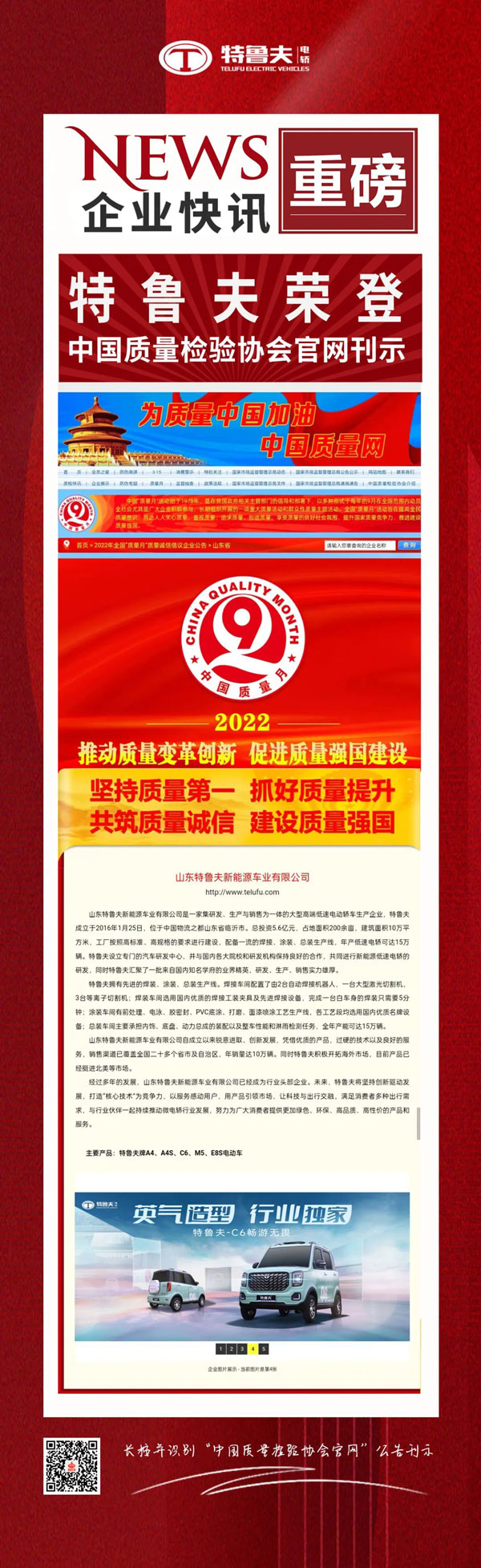 在經(jīng)過(guò)企業(yè)申報(bào)、質(zhì)量誠(chéng)信調(diào)查、社會(huì)評(píng)價(jià)、專(zhuān)家評(píng)審等多個(gè)環(huán)節(jié)層層考核后,特魯夫順利通過(guò)此批次多項(xiàng)證書(shū)認(rèn)證審核,“榮獲全國(guó)新能源電轎行業(yè)質(zhì)量領(lǐng)先品牌”、“全國(guó)新能源電轎行業(yè)質(zhì)量領(lǐng)先企業(yè)”、“全國(guó)質(zhì)量檢驗(yàn)誠(chéng)信企業(yè)”、“全國(guó)產(chǎn)品和服務(wù)質(zhì)量誠(chéng)信品牌”、“全國(guó)質(zhì)量檢驗(yàn)穩(wěn)定合格產(chǎn)品”五大榮譽(yù)證書(shū)。