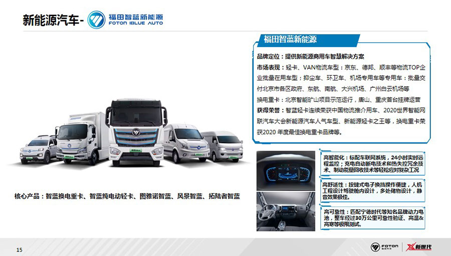 推動產(chǎn)業(yè)創(chuàng)新發(fā)展。福田汽車秉承“聚焦價(jià)值 精益運(yùn)營”的經(jīng)營理念,圍繞“智能化、新能源化、網(wǎng)聯(lián)化、輕量化”創(chuàng)新理念,引領(lǐng)行業(yè)突破創(chuàng)新。福田汽車積極參與國家強(qiáng)制性標(biāo)準(zhǔn)制定29項(xiàng),占現(xiàn)有標(biāo)準(zhǔn)總數(shù)四分之一,授權(quán)專利達(dá)6000件。緊跟全球趨勢打造智能制造標(biāo)桿,入選工信部智能制造試點(diǎn)示范項(xiàng)目,并榮獲“國家級綠色工廠”稱號。2019年“國創(chuàng)中心—福田汽車新能源智能物流車實(shí)驗(yàn)室”揭牌,正式加入國家級技術(shù)創(chuàng)新中心,作為國內(nèi)最早一批布局新能源領(lǐng)域的商用車企業(yè),福田汽車自主掌握核心三電科技,并成為國內(nèi)首家獲得智能重卡開放道路測試牌照的商用車企業(yè),積極推動新能源與智能技術(shù)的研發(fā)與落地,推動產(chǎn)業(yè)良性發(fā)展。