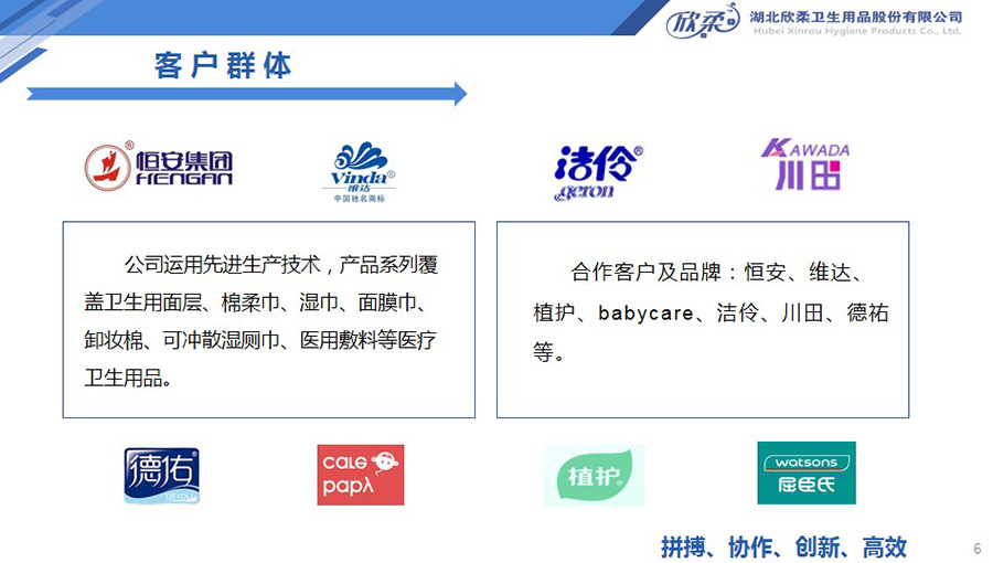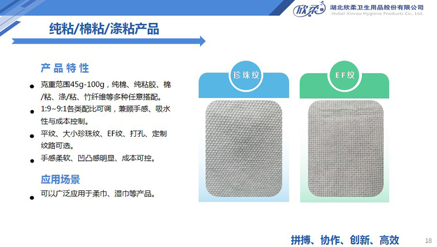 欣柔是以一次性醫(yī)衛(wèi)及生活用非織造材料為主導(dǎo),同時(shí)集生產(chǎn)銷(xiāo)售醫(yī)衛(wèi)用脫脂纖維和擦拭類(lèi)終端產(chǎn)品的高新技術(shù)企業(yè),欣柔秉承“人才為本,科技領(lǐng)先,用戶至上”的經(jīng)營(yíng)理念,努力打造成為一家以研發(fā)創(chuàng)新為驅(qū)動(dòng)力,以功能型、差異化產(chǎn)品為牽引力的專業(yè)醫(yī)衛(wèi)用非織造材料供應(yīng)商及生活用品提供商。