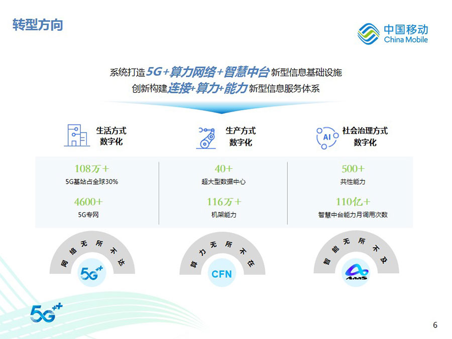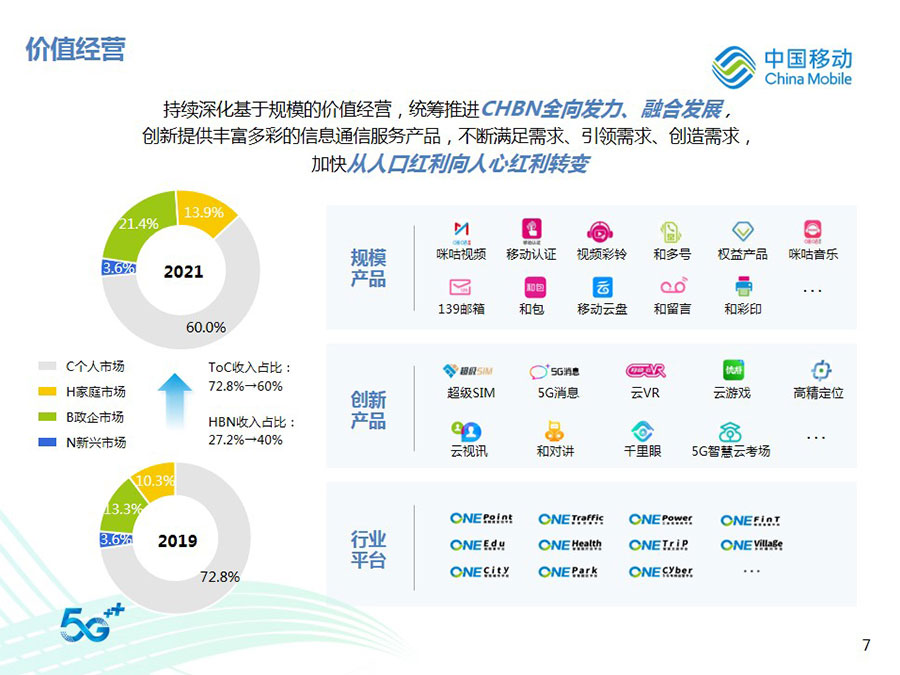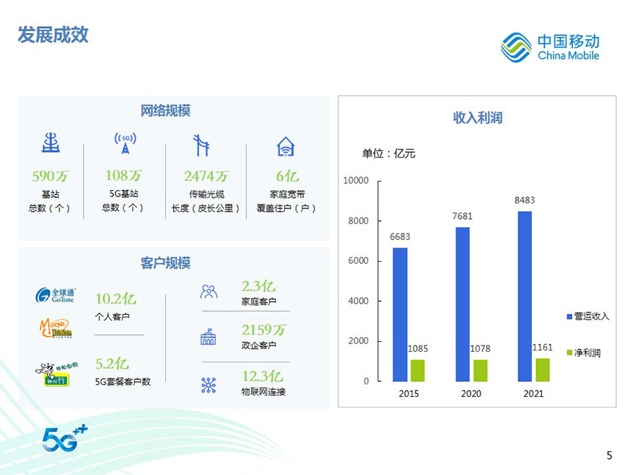 2022年,中國(guó)移動(dòng)全年?duì)I運(yùn)收入達(dá)到人民幣9,373億元,同比增長(zhǎng)10.5%,其中通信服務(wù)收入達(dá)到人民幣8,121億元,同比增長(zhǎng)8.1%。CHBN客戶(hù)規(guī)模、收入規(guī)模全面增長(zhǎng),HBN收入占通信服務(wù)收入比達(dá)到39.8%,同比提升4.1個(gè)百分點(diǎn)。得益于5G應(yīng)用、移動(dòng)云、數(shù)字內(nèi)容、智慧家庭等業(yè)務(wù)的快速拓展,數(shù)字化轉(zhuǎn)型收入達(dá)到人民幣2,076億元,同比增長(zhǎng)30.3%。整體來(lái)看,公司著力打造的數(shù)字化轉(zhuǎn)型收入增長(zhǎng)“第二曲線”卓有成效,收入結(jié)構(gòu)更加均衡穩(wěn)健,可持續(xù)增長(zhǎng)動(dòng)能不斷增強(qiáng),抗風(fēng)險(xiǎn)能力顯著提升。