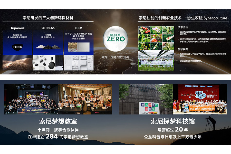 在發(fā)展各項(xiàng)業(yè)務(wù)的同時,索尼矢志不渝履行對地球的“責(zé)任”,并通過技術(shù)和業(yè)務(wù)為地球做“貢獻(xiàn)”。在“走向零負(fù)荷”的環(huán)境目標(biāo)指導(dǎo)下,在中國,索尼已從2020-2022財年連續(xù)實(shí)現(xiàn)100%可再生能源用電,并將多樣創(chuàng)新的環(huán)保技術(shù)成果引入中國:包括將多樣植物高密度混種以回歸自然生態(tài)的“協(xié)生農(nóng)法”,索尼獨(dú)自開發(fā)的三大創(chuàng)新環(huán)保材料SORPLARSTM,TriporousTM,OBM等等。
