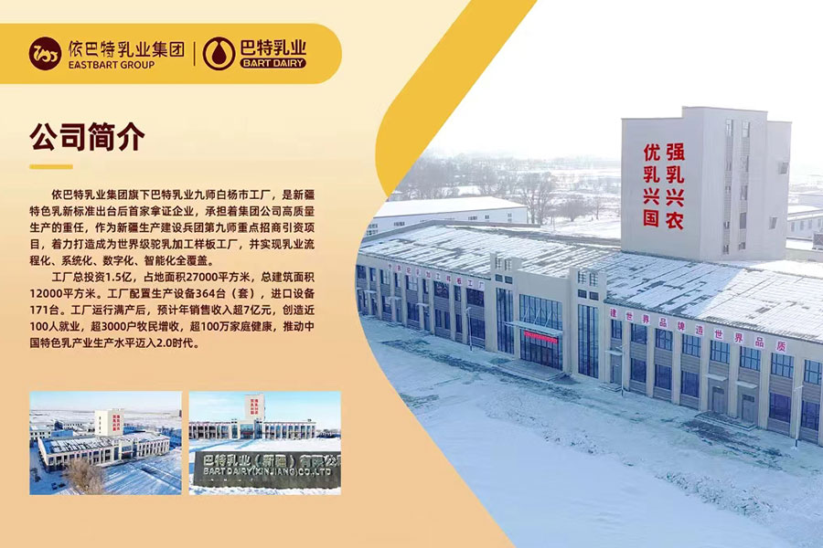 巴特乳業(yè)新疆塔城工廠是依巴特乳業(yè)集團核心業(yè)務(wù)板塊之一,總投資1.5億,占地40余畝,承擔(dān)著高質(zhì)量生產(chǎn)的重任。地址位于新疆建設(shè)兵團第九師白楊市巴克圖經(jīng)濟技術(shù)開發(fā)區(qū)產(chǎn)業(yè)大街1號。作為新疆生產(chǎn)建設(shè)兵團第九師重點招商引資項目,著力打造成為世界級駝乳樣板工廠,并實現(xiàn)乳業(yè)流程化、系統(tǒng)化、數(shù)字化、智能化全覆蓋。全面投產(chǎn)后年產(chǎn)值約12億元。工廠投產(chǎn)后年產(chǎn)5000噸駱駝乳粉,年產(chǎn)全脂純生駝乳粉1500噸,年產(chǎn)駝乳配方粉1500噸;項目二期計劃建設(shè)常溫奶生產(chǎn)線一條,建設(shè)酸奶生產(chǎn)線一條,年產(chǎn)駱駝乳純奶1000噸;年產(chǎn)駱駝純酸奶1000噸。以滿足國內(nèi)市場及歐盟、中東、中非、東南亞等國家和地區(qū)出口需求。