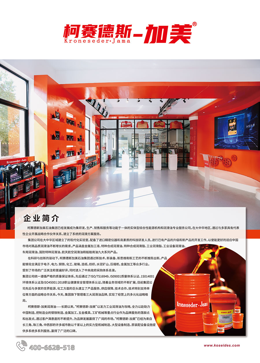 主要產(chǎn)品:柯賽德斯-加美Kroneseder?Jama、中訊高科ZHONGXUN、柯賽德Kroneseder三大品牌,產(chǎn)品涵蓋金屬加工油液、特種合成潤(rùn)滑油、特種合成潤(rùn)滑脂、工業(yè)潤(rùn)滑脂、工業(yè)設(shè)備潤(rùn)滑油、車用潤(rùn)滑油、國(guó)防特種潤(rùn)滑油、航天航空潤(rùn)滑油和船舶用油九大系列產(chǎn)品