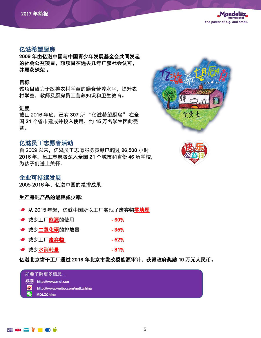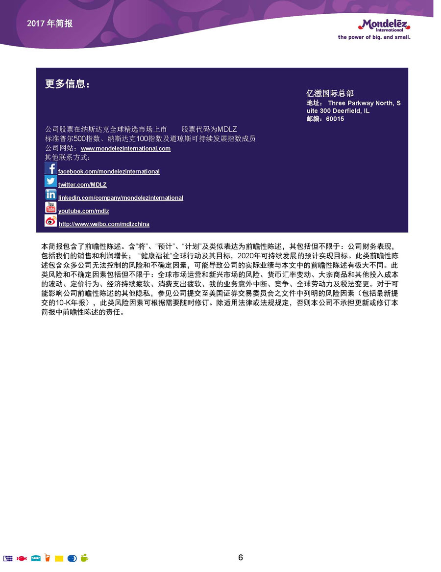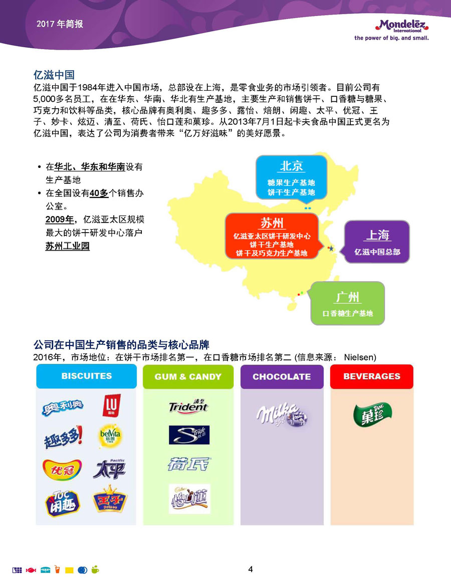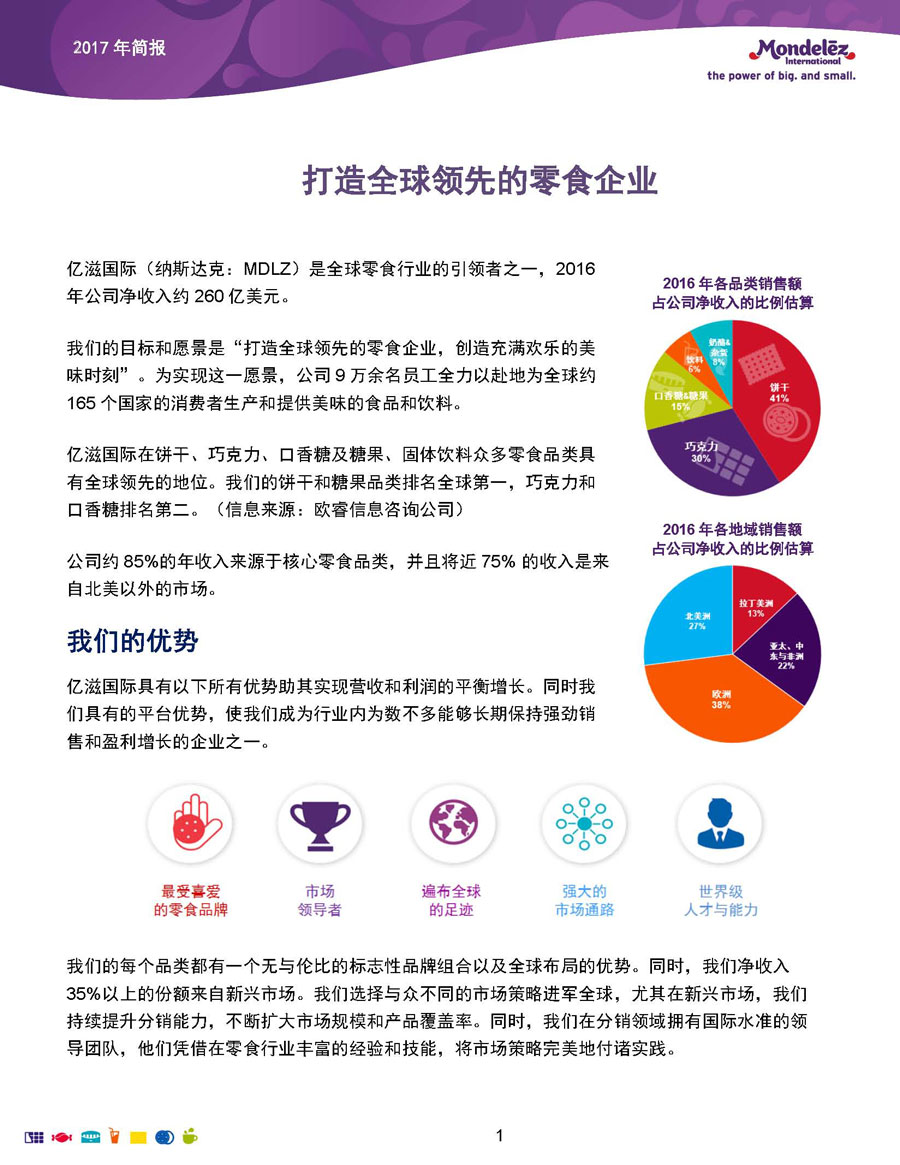我們的目標和愿景是:打造全球領先的零食企業(yè),創(chuàng)造充滿歡樂的美味時刻。為實現(xiàn)這一愿景,公司9萬余名員工全力以赴地為全球約165個國家的消費者生產(chǎn)和提供美味的食品和飲料。