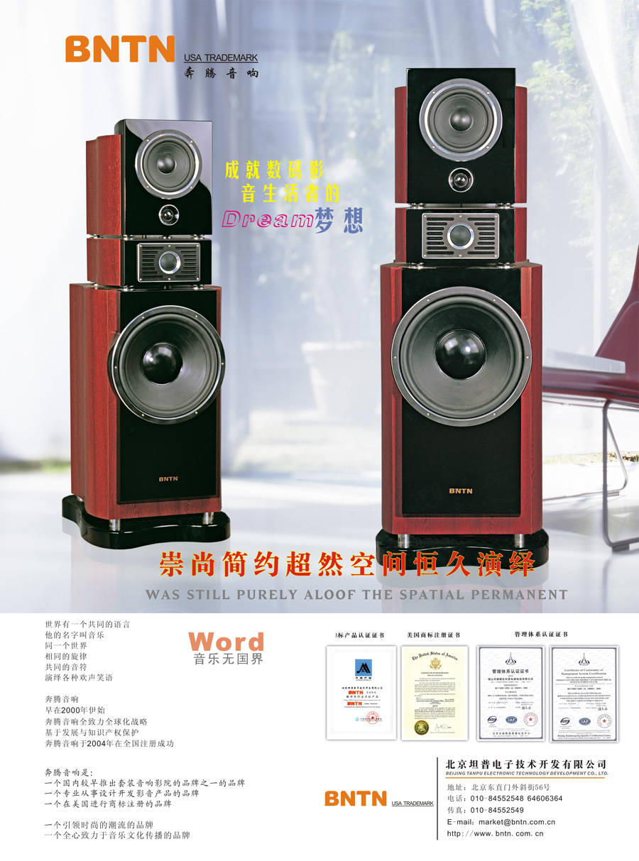 北京坦普電子技術(shù)開發(fā)有限公司是一家專業(yè)從事家庭影院設(shè)計(jì)、開發(fā)、銷售的公司,其主打品牌BNTN奔騰音響(中國(guó)中文注冊(cè)“萬馬奔騰”)是國(guó)內(nèi)較早推出套裝音響影院的品牌之一。