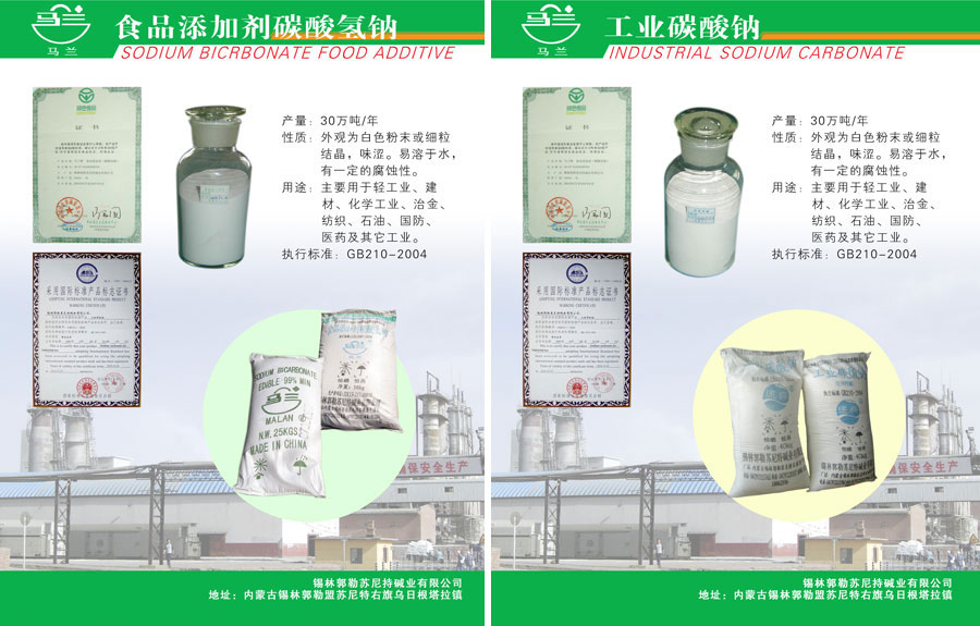 錫林郭勒蘇尼特堿業(yè)有限公司生產(chǎn)的“馬蘭”牌系列產(chǎn)品是內(nèi)蒙古自治區(qū)名優(yōu)產(chǎn)品。其注冊(cè)商標(biāo)“馬蘭”牌系列產(chǎn)品是內(nèi)蒙古自治區(qū)名牌產(chǎn)品,“馬蘭”牌也是全區(qū)著名商標(biāo)。“馬蘭”牌小蘇打多次被評(píng)為自治區(qū)優(yōu)質(zhì)產(chǎn)品和出口免驗(yàn)產(chǎn)品。其產(chǎn)品除暢銷全國(guó)各地外,還以其優(yōu)質(zhì)優(yōu)價(jià)打入國(guó)際市場(chǎng),并在日本、阿聯(lián)酋等7個(gè)國(guó)家和地區(qū)注冊(cè)商標(biāo)。