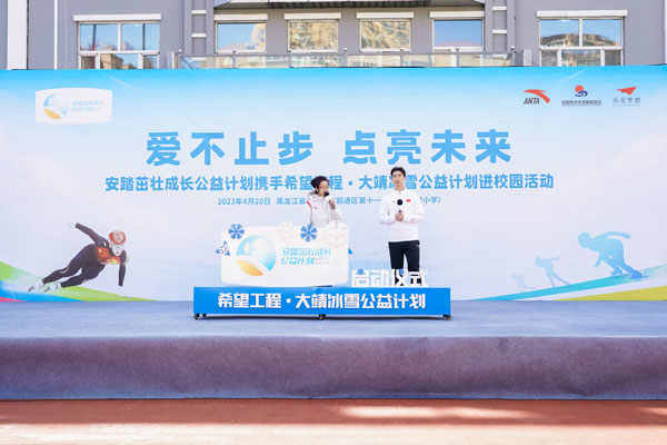 2023年4月20日,安踏茁壯成長公益計劃攜手希望工程·大靖冰雪公益計劃進校園啟動儀式,在黑龍江省佳木斯市前進區(qū)第十一小學(xué)(下簡稱十一小學(xué))舉行。通過體教融合,深耕青少年體育公益,發(fā)展冰雪運動,為青少年茁壯成長賦能。安踏集團為十一小學(xué)全體師生捐贈了安踏裝備包,捐建了武大靖-安踏夢想中心,體育教師接受了安踏體育課教師培訓(xùn)。短道速滑奧運冠軍武大靖重返兒時母校,分享冠軍故事,首次推出大靖冰雪課。安踏集團執(zhí)行董事、聯(lián)席CEO吳永華,安踏集團副總裁李玲,共青團黑龍江省委書記徐長勇,黑龍江省佳木斯市委副書記、代市長王鐵,上海真愛夢想公益基金會理事長潘江雪,共同出席活動,央視頻進行了全程直播。