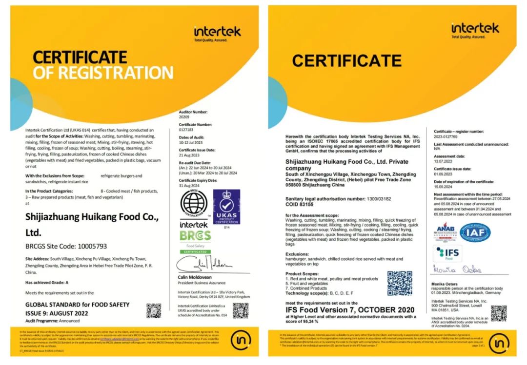 2023年8月,石家莊市惠康食品有限公司再次通過了歐洲BRC和IFS雙認證年審。又一次驗證了惠康食品一直以來對食品安全和質(zhì)量的高標(biāo)準(zhǔn)、嚴(yán)要求,不僅說明了惠康食品擁有比肩一線國際大牌同等的實力,還說明了其品質(zhì)安全也一直保持著國際水準(zhǔn),能給予消費者足夠的安全感。