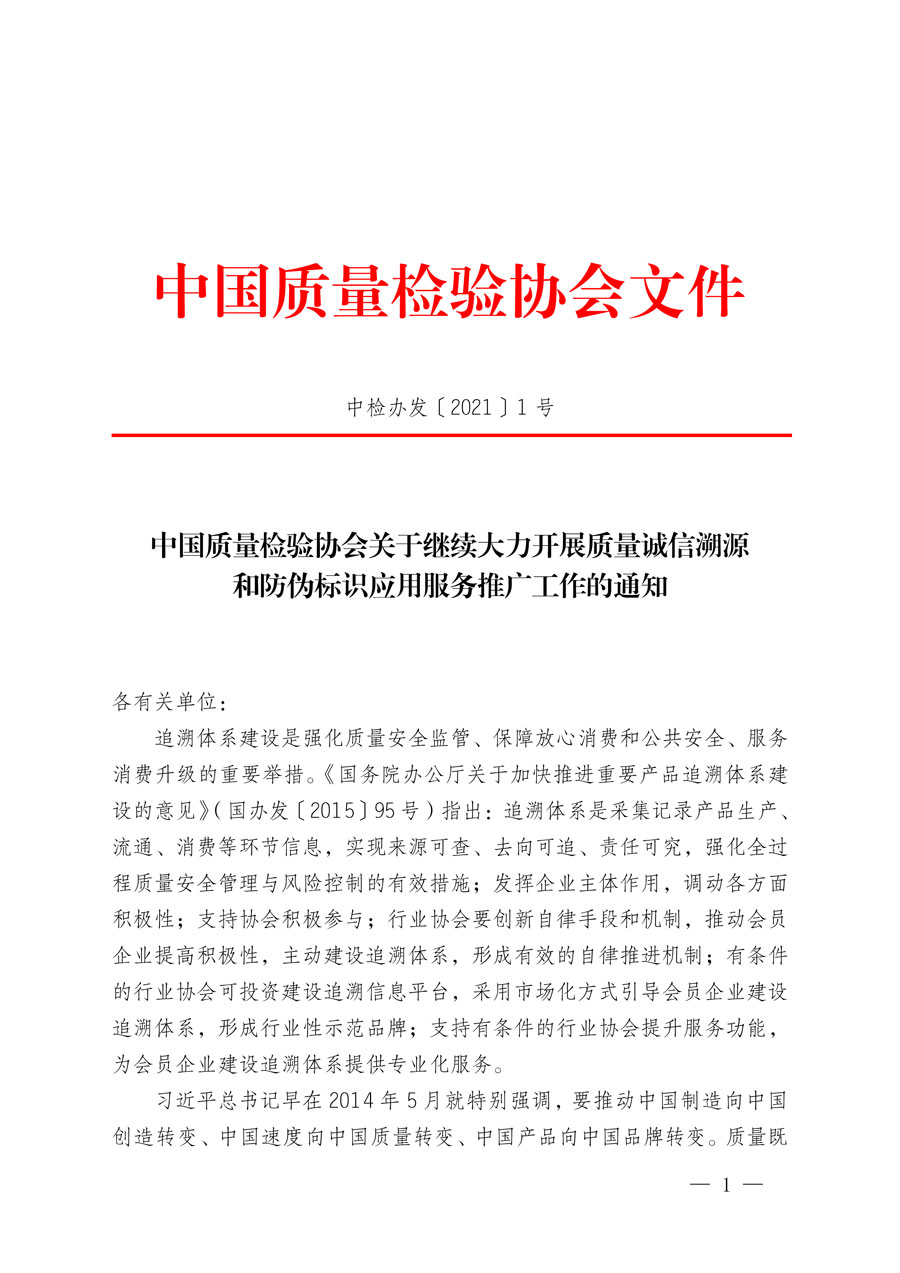 中國(guó)質(zhì)量檢驗(yàn)協(xié)會(huì)關(guān)于繼續(xù)大力開展質(zhì)量誠信溯源