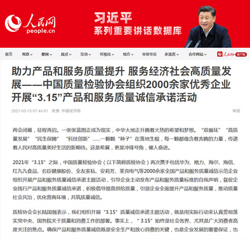人民網(wǎng):2000家質(zhì)量領(lǐng)先企業(yè)開展 "3.15"產(chǎn)品和服務(wù)質(zhì)量誠信承諾活動(dòng)