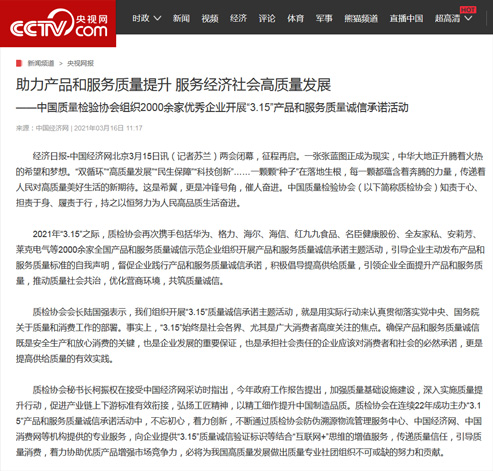 央視網(wǎng):助力產(chǎn)品和服務(wù)質(zhì)量提升 服務(wù)經(jīng)濟(jì)社會(huì)高質(zhì)量發(fā)展——中國質(zhì)量檢驗(yàn)協(xié)會(huì)組織2000余家優(yōu)秀企業(yè)開展“3.15”產(chǎn)品和服務(wù)質(zhì)量誠信承諾活動(dòng)