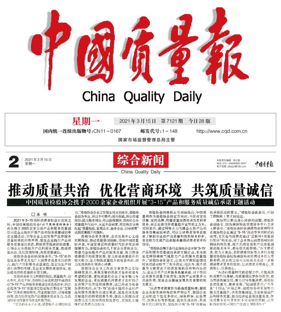 中國質(zhì)量報(bào)(3月15日刊第2版):推動(dòng)質(zhì)量共治 優(yōu)化營商環(huán)境 共筑質(zhì)量誠信——中國質(zhì)量檢驗(yàn)協(xié)會(huì)攜手2000余家企業(yè)組織開展“3 ·15”產(chǎn)品和服務(wù)質(zhì)量誠信承諾主題活動(dòng)