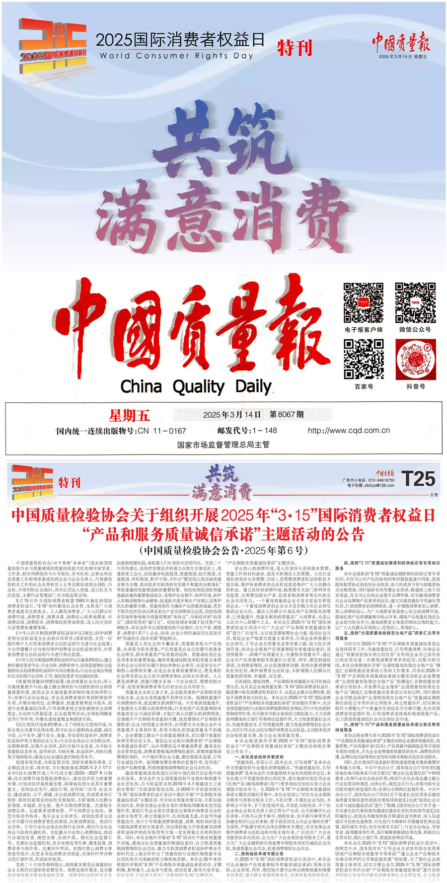 《中國質(zhì)量報(bào)》(2025年3月14日刊)發(fā)布:中國質(zhì)量檢驗(yàn)協(xié)會(huì)關(guān)于組織開展2025年“3·15”國際消費(fèi)者權(quán)益日“產(chǎn)品和服務(wù)質(zhì)量誠信承諾”主題活動(dòng)的公告(2025年第6號(hào))