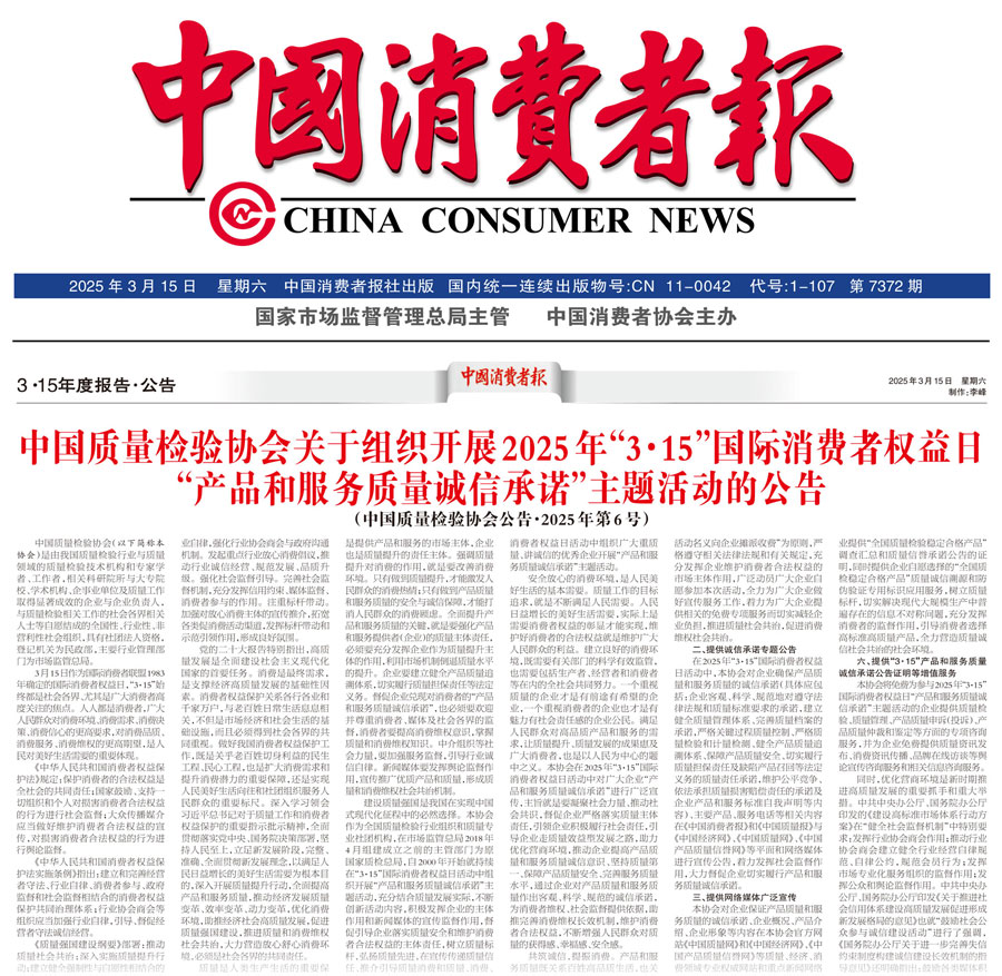 《中國消費(fèi)者報(bào)》(2025年3月15日刊)發(fā)布:中國質(zhì)量檢驗(yàn)協(xié)會(huì)關(guān)于組織開展2025年“3·15”國際消費(fèi)者權(quán)益日“產(chǎn)品和服務(wù)質(zhì)量誠信承諾”主題活動(dòng)的公告(2025年第6號(hào))