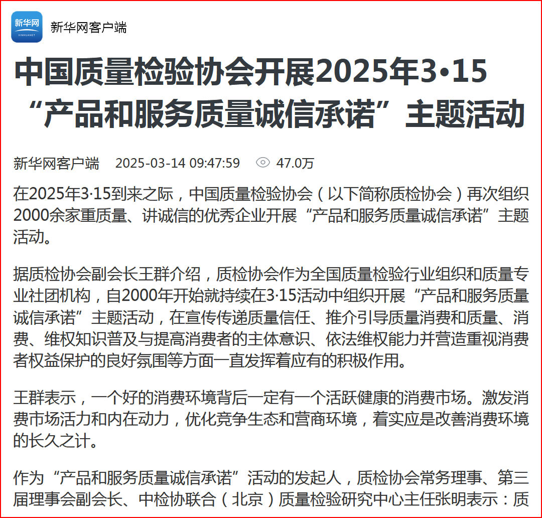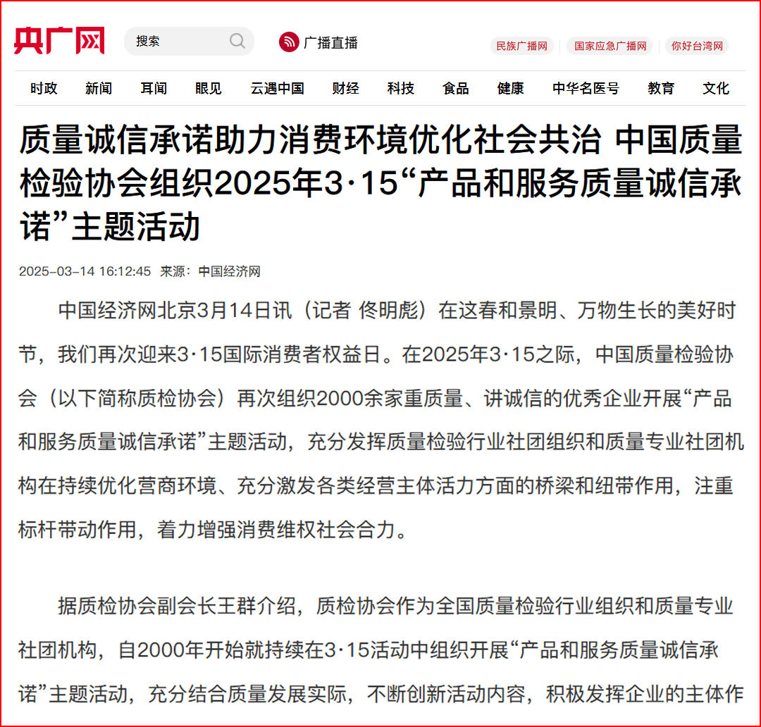 中國經(jīng)濟(jì)網(wǎng)“質(zhì)量經(jīng)濟(jì)頻道”發(fā)布:質(zhì)量誠信承諾助力消費(fèi)環(huán)境優(yōu)化社會(huì)共治——中國質(zhì)量檢驗(yàn)協(xié)會(huì)組織2025年3·15“產(chǎn)品和服務(wù)質(zhì)量誠信承諾”主題活動(dòng)
