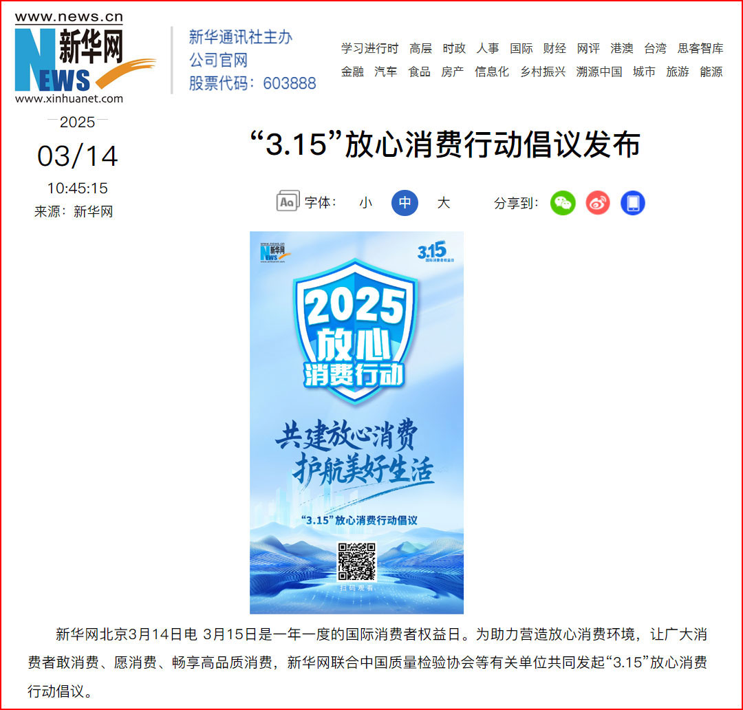 新華網(wǎng)北京3月14日電 3月15日是一年一度的國際消費(fèi)者權(quán)益日。為助力營造放心消費(fèi)環(huán)境,讓廣大消費(fèi)者敢消費(fèi)、愿消費(fèi)、暢享高品質(zhì)消費(fèi),新華網(wǎng)聯(lián)合中國質(zhì)量檢驗(yàn)協(xié)會(huì)等有關(guān)單位共同發(fā)起“3.15”放心消費(fèi)行動(dòng)倡議。
