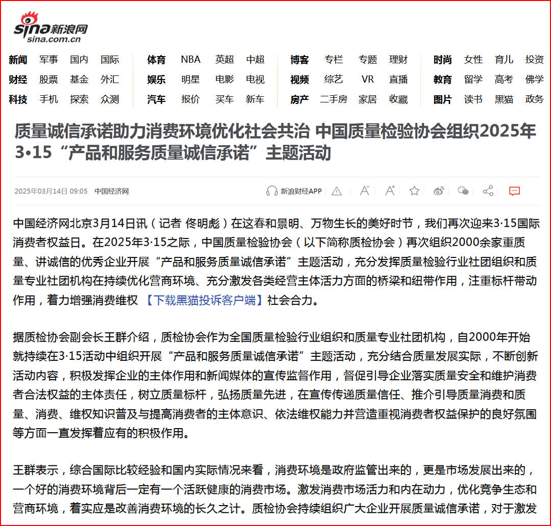 新浪網(wǎng)報(bào)道:共鑄質(zhì)量誠信 提振消費(fèi)信心